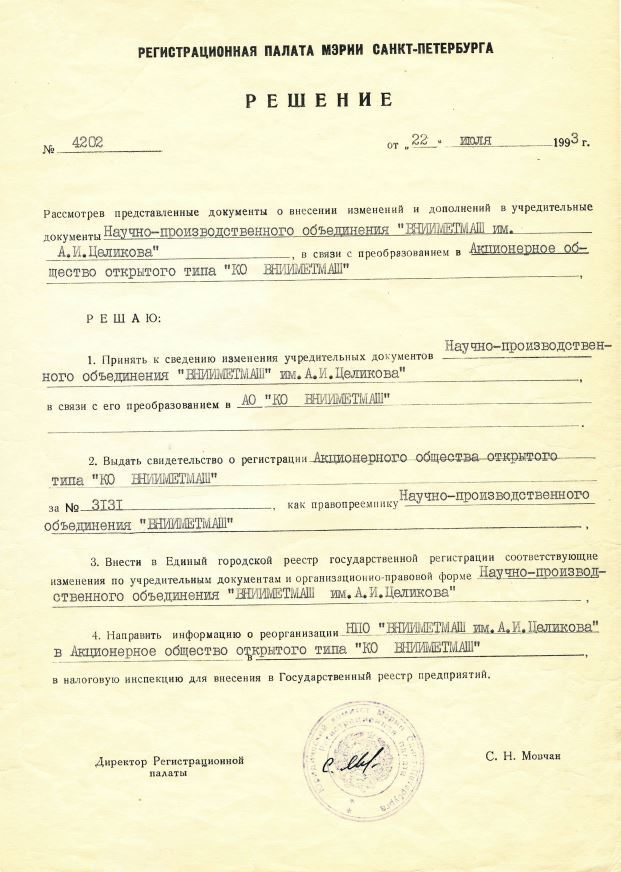 После распада СССР, в результате приватизации,в 1993 году «Колпинское отделение» полностью вышло из состава ВНИИМЕТМАШ им. ак. А.И.Целикова и было зарегистрировано, как акционерное общество с сокращенным названием «КО ВНИИМЕТМАШ».