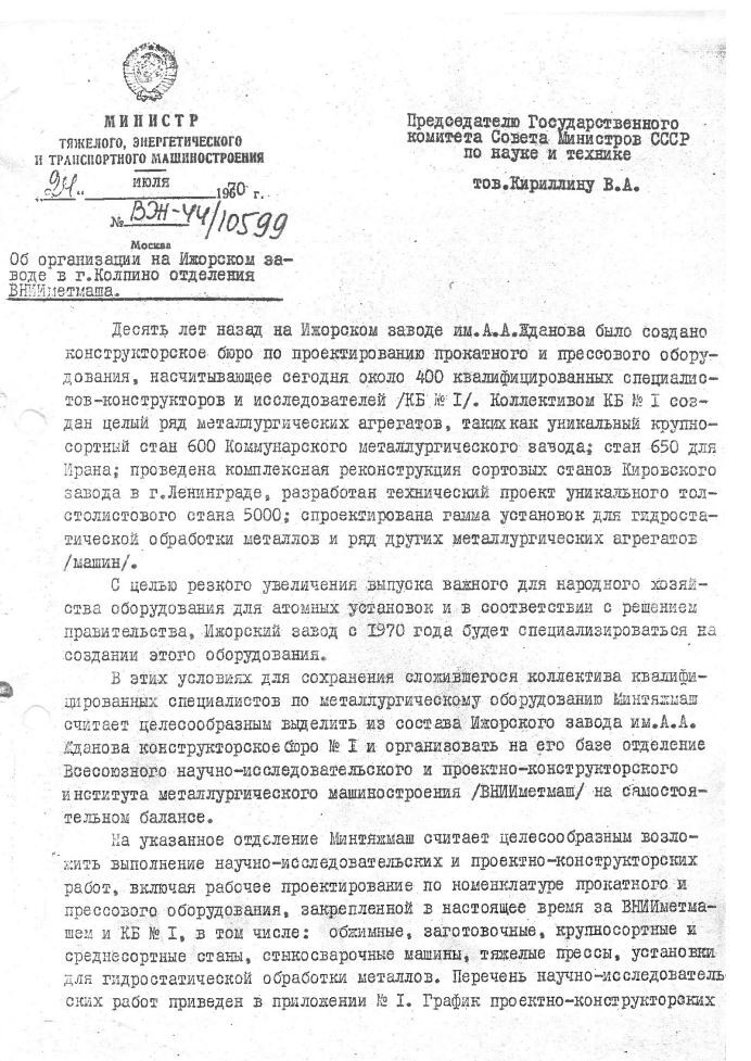 В I97Ог. в связи с расширением задач по проектированию прокатного и прессового оборудования для нужд промышленности Советского Союза КБ-1 было преобразовано в Колпинское отделение ВНИИМЕТМАШ на основании Приказа министра тяжелого, энергетического и транспортного машиностроения СССР от 2 июля 1970 года №242 «Об организации отделения Всесоюзного научно-производственного объединения ВНИИМЕТмаша в г.Колпино».